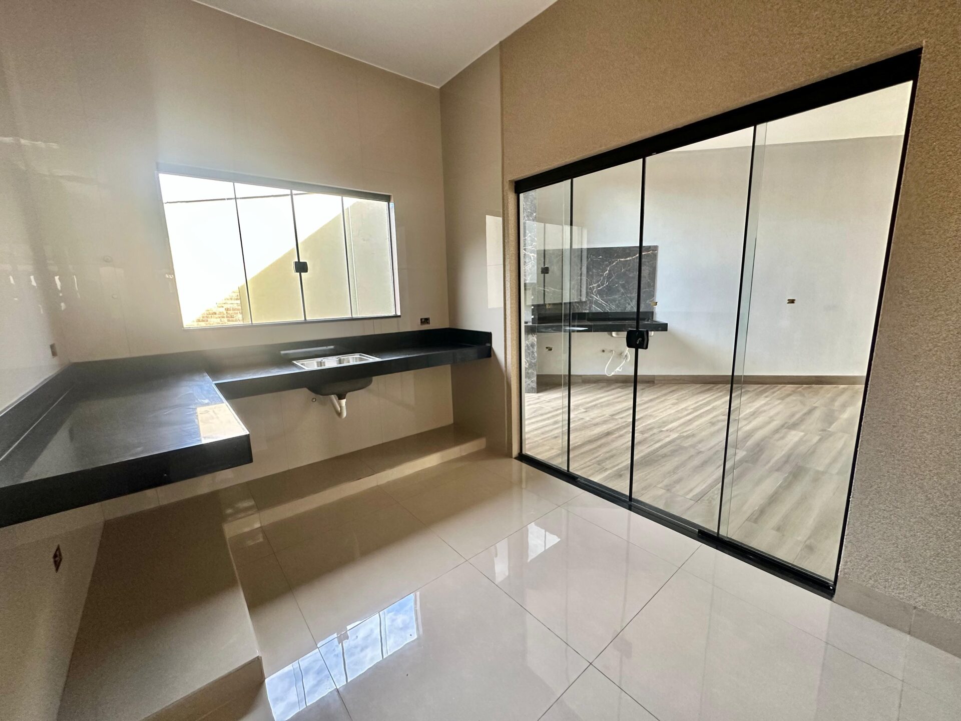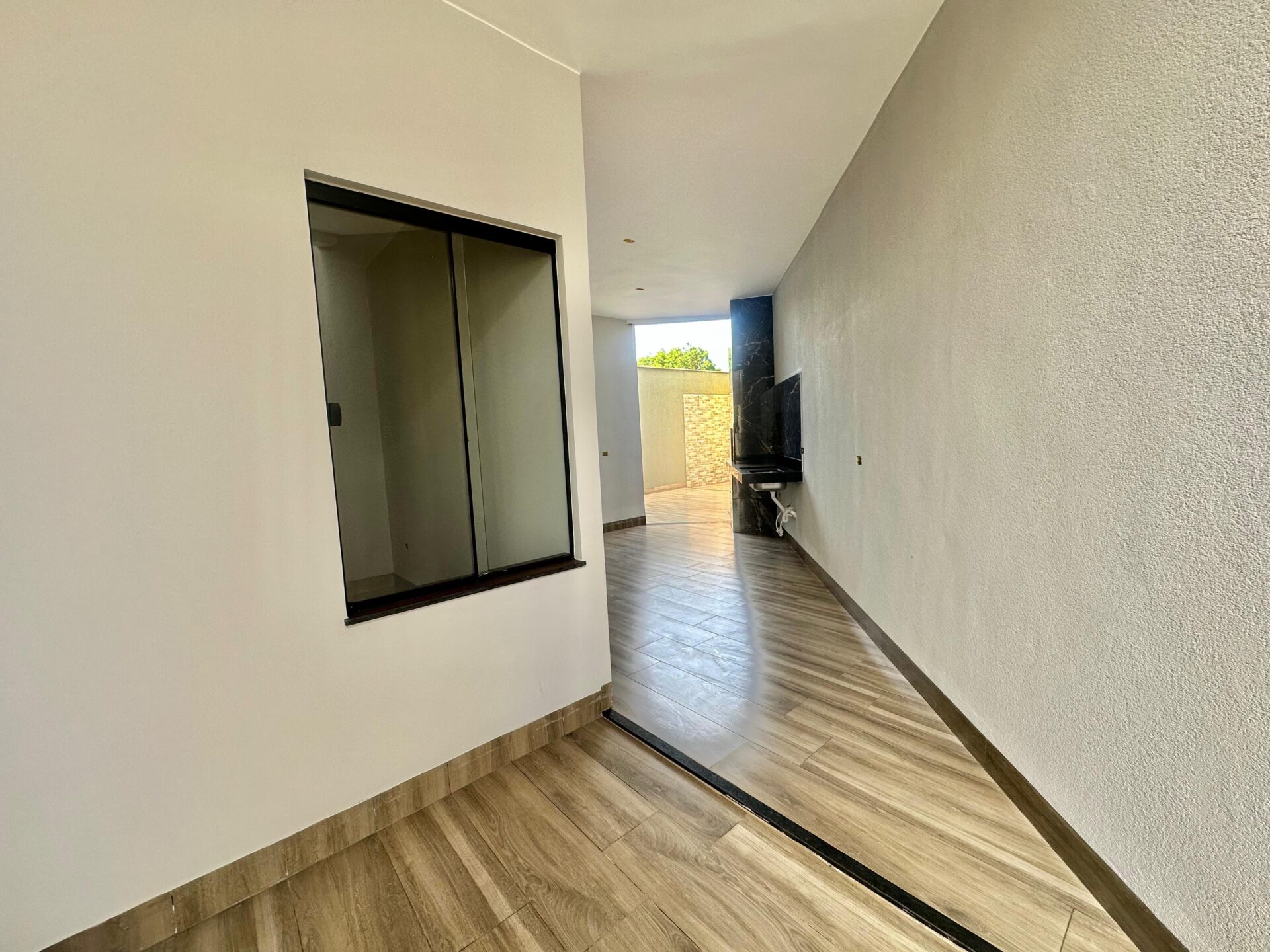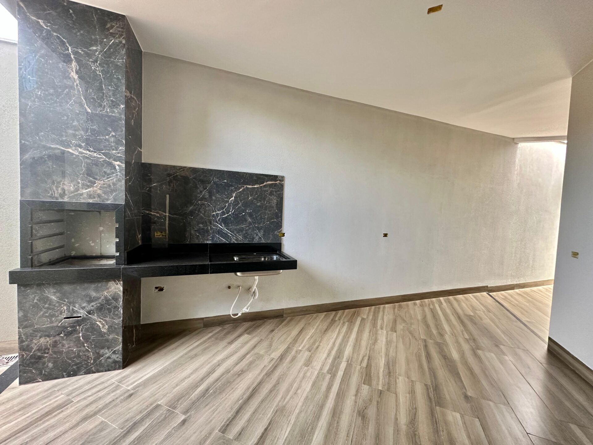 3 quartos, sendo 1 suíte, banheiro social, sala, cozinha, varanda gourmet com churrasqueira, área de serviço e garagem, piso porcelanato e forro de laje.