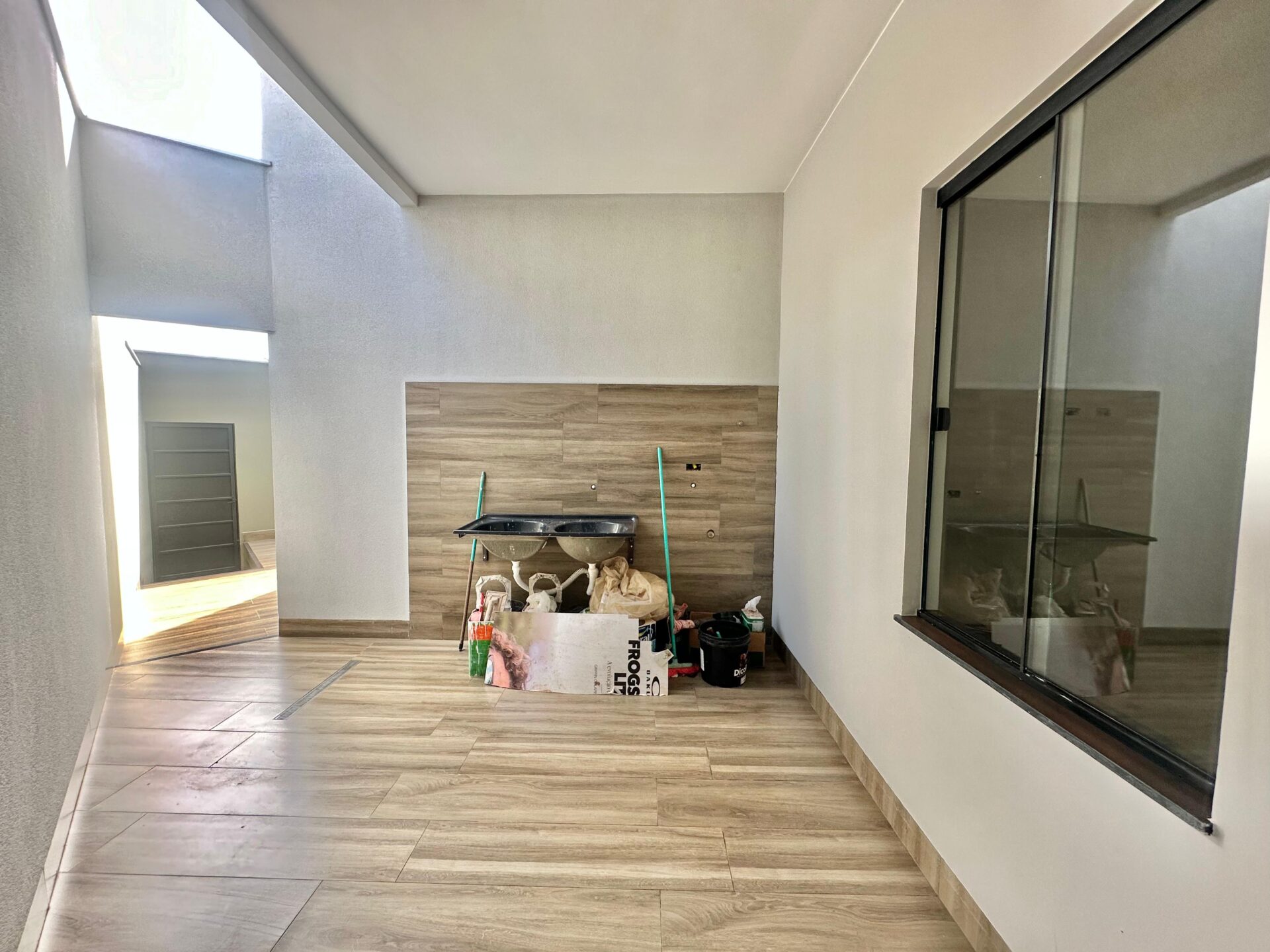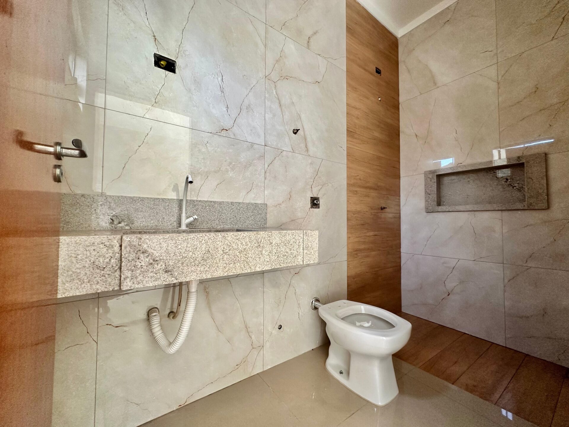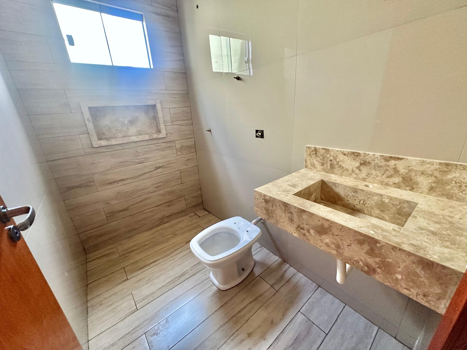 3 quartos, sendo 1 suíte, banheiro social, sala, cozinha, varanda gourmet com churrasqueira, área de serviço e garagem, piso porcelanato e forro de laje.