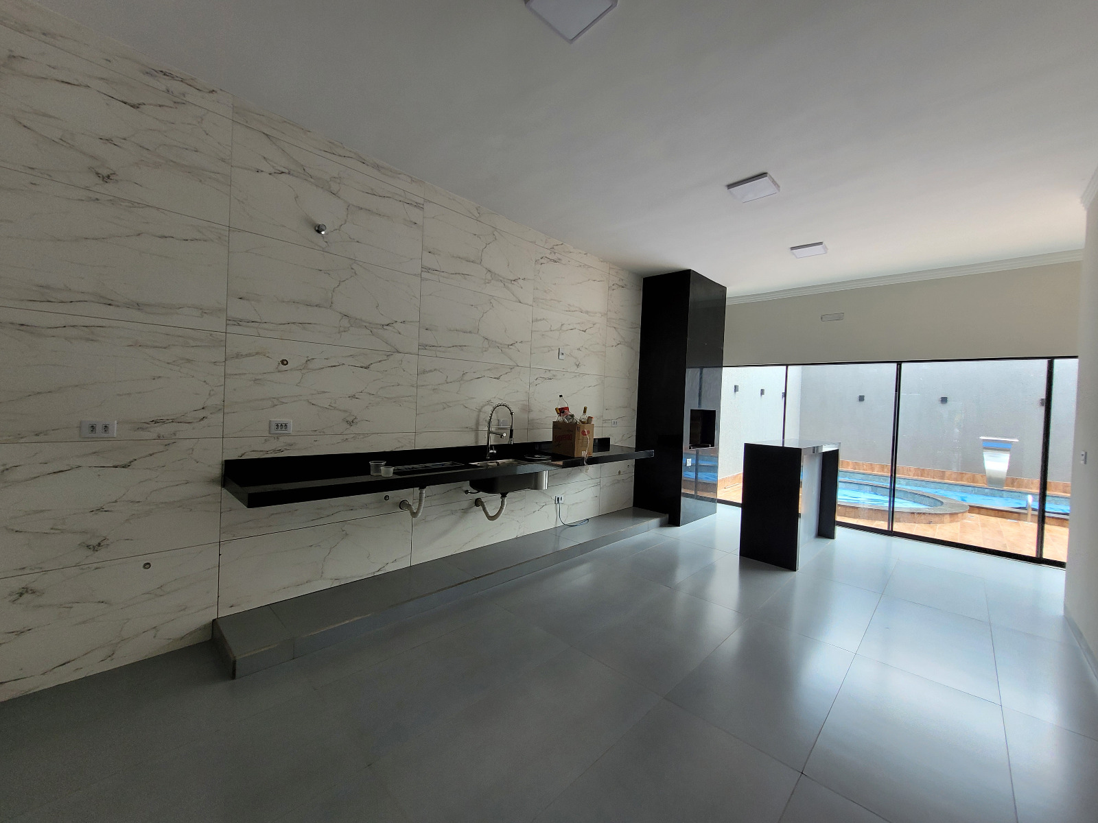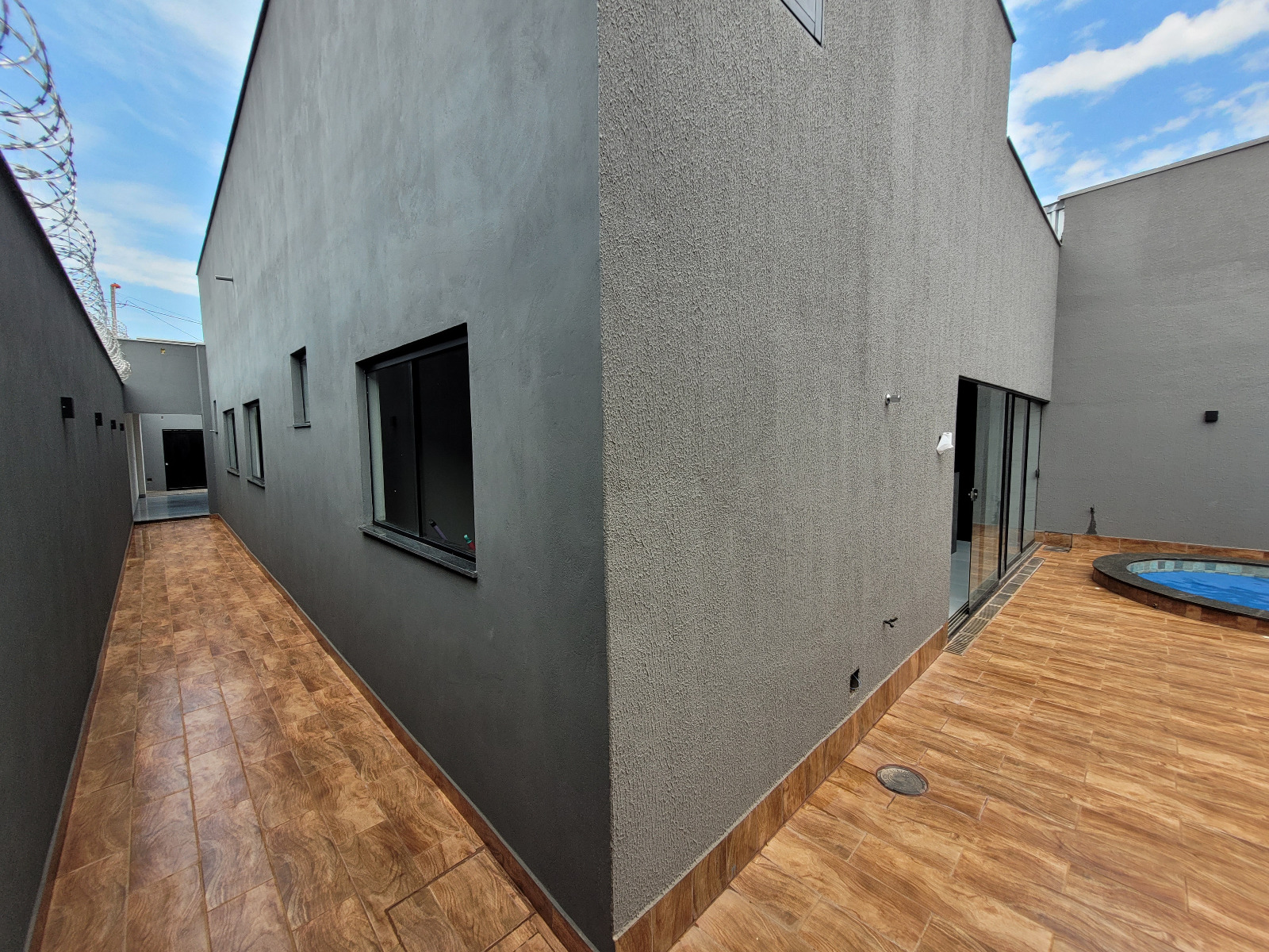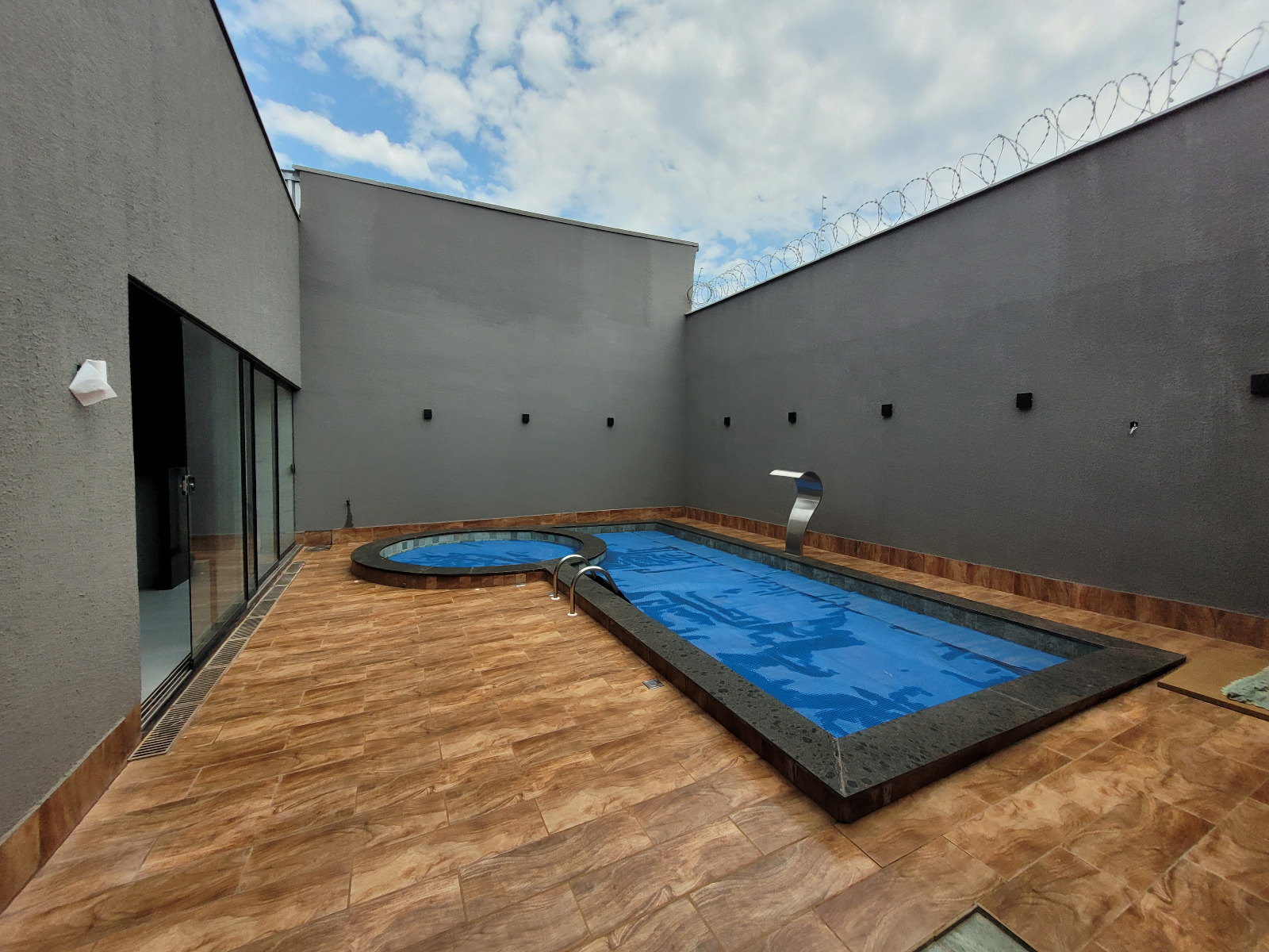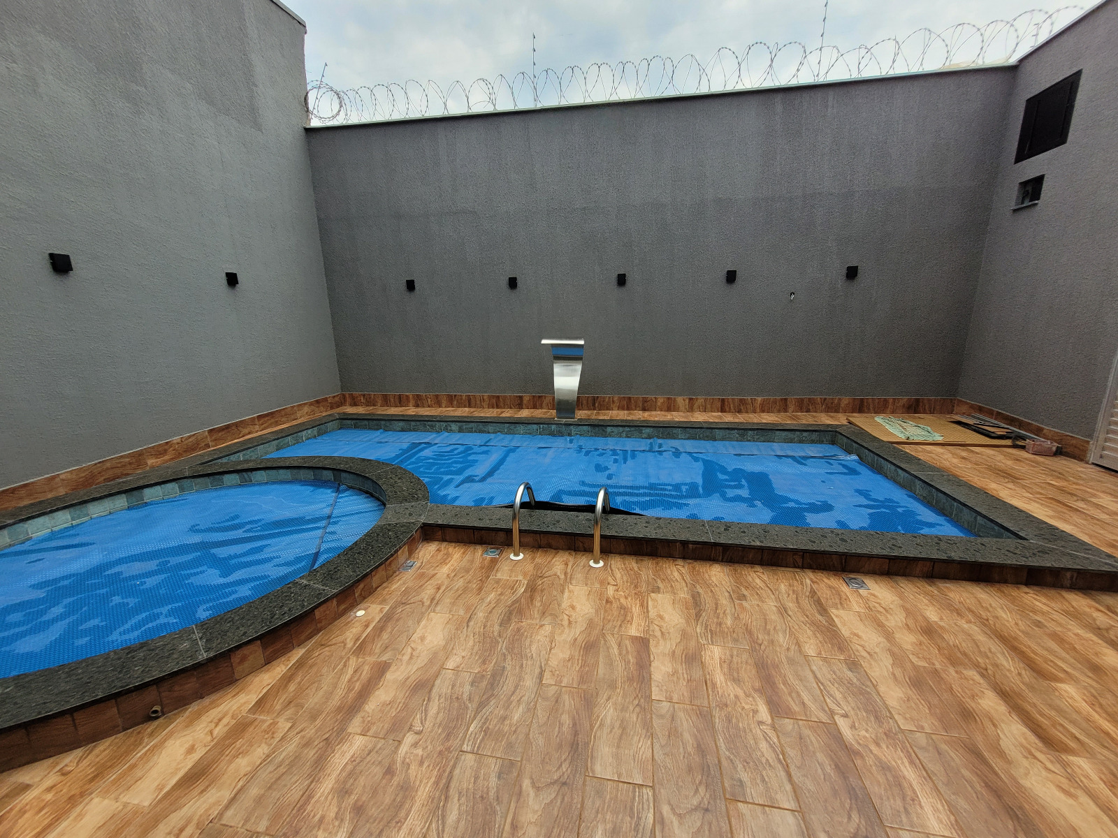 03  Quartos sendo 01 suíte c/ Closet,  Banheiro Social, Sala Ampla, Copa, Cozinha c/ área gourmet integrada, Lavanderia,  Banheiro na área de Lazer,  Dispensa, Garagem para 4 carros sendo 2 cobertos,  Piscina aquecida, Ofurô aquecido c/ hidromassagem. Terreno: 10×30 = 300m²
