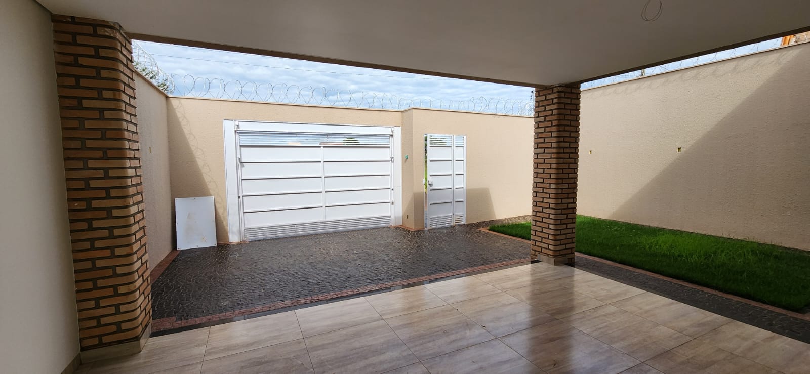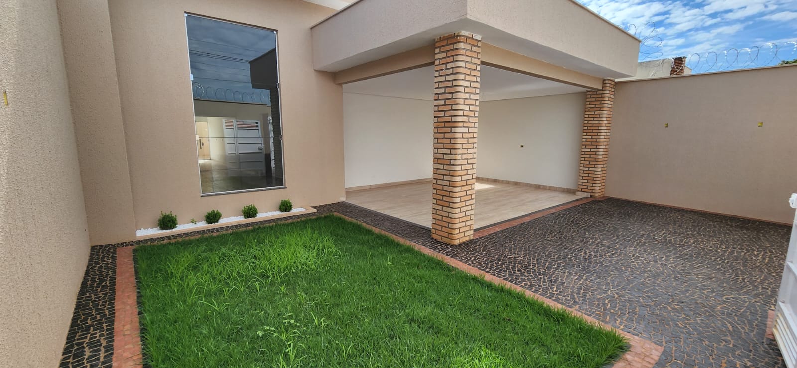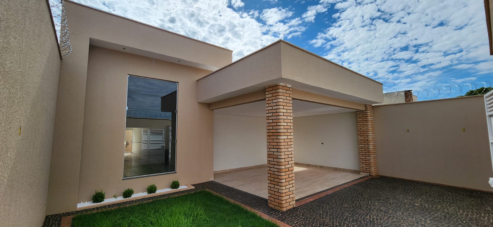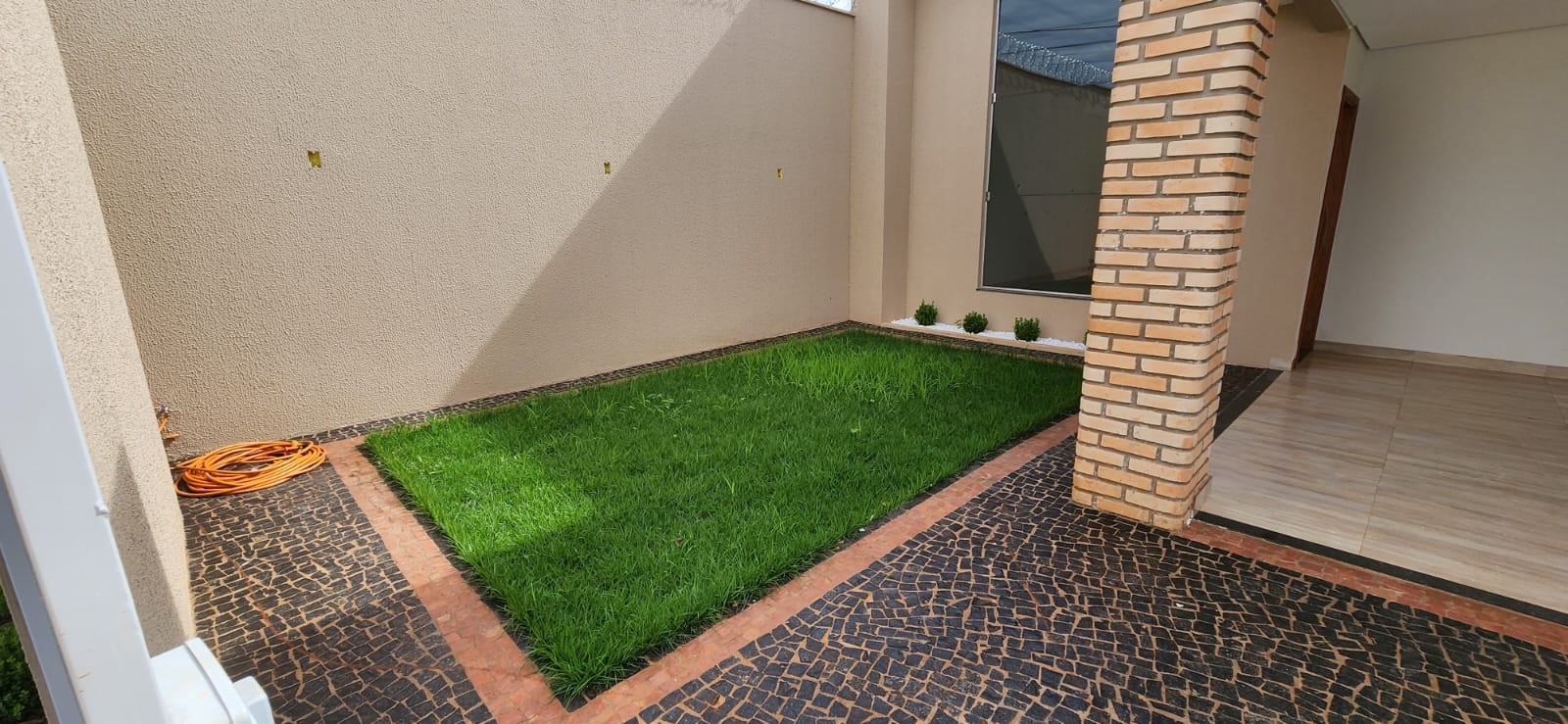 Calçada e frente da casa em pedra portuguesa preta com detalhe rosa, totalmente resinadas; Jardim com gramado e plantas ornamentais na frente da casa; Tubulação hidráulica 100% Tigre; Pré-instalação de ar condicionado e drenos em todos os cômodos; Tubulação de gás embutida para cooktop; Lixeira premium reforçada; Portão basculante de 3,50m, em alto padrão; Portão social com fechadura elétrica; Concertinas instaladas; Ducha na área externa; Piso em porcelanato, com rodapés embutidos; Lavanderia separada da casa;
