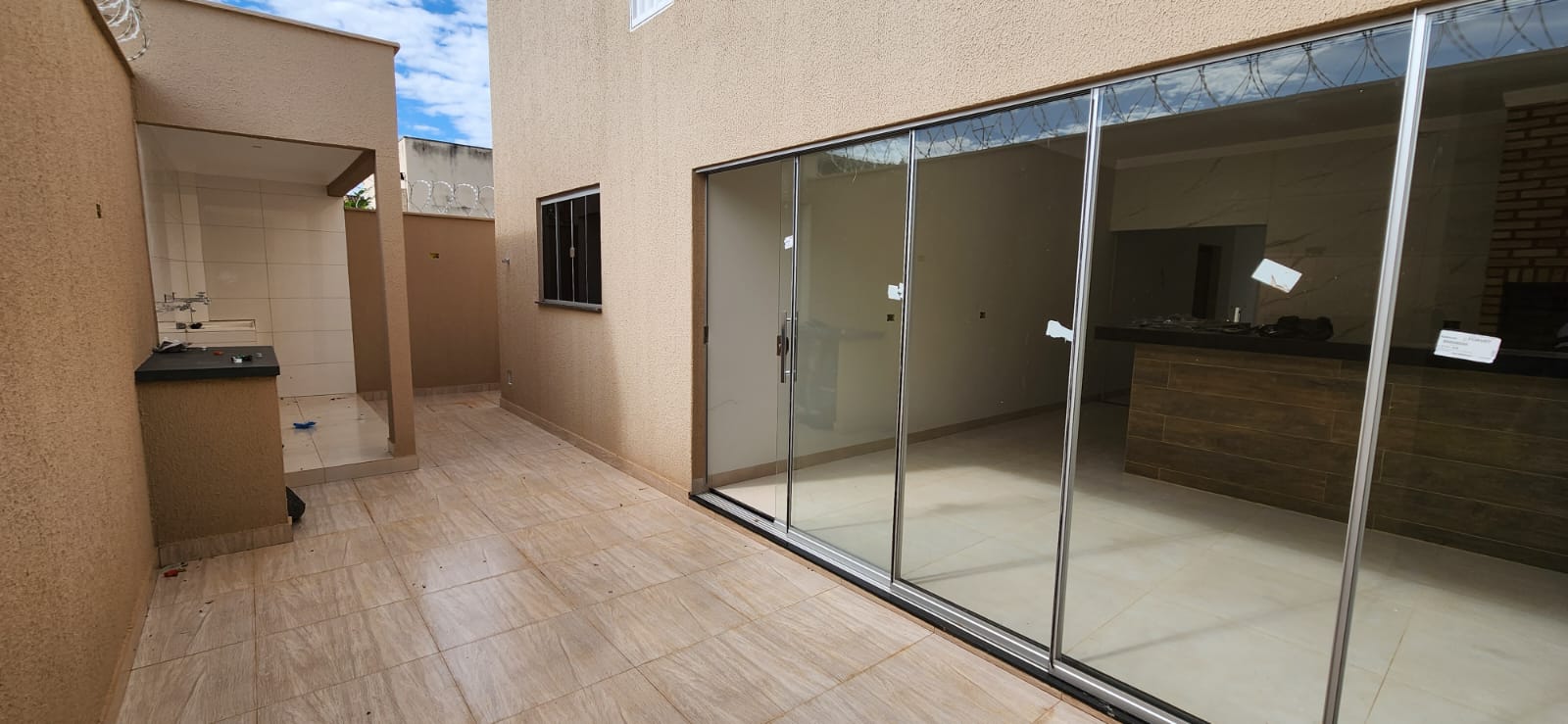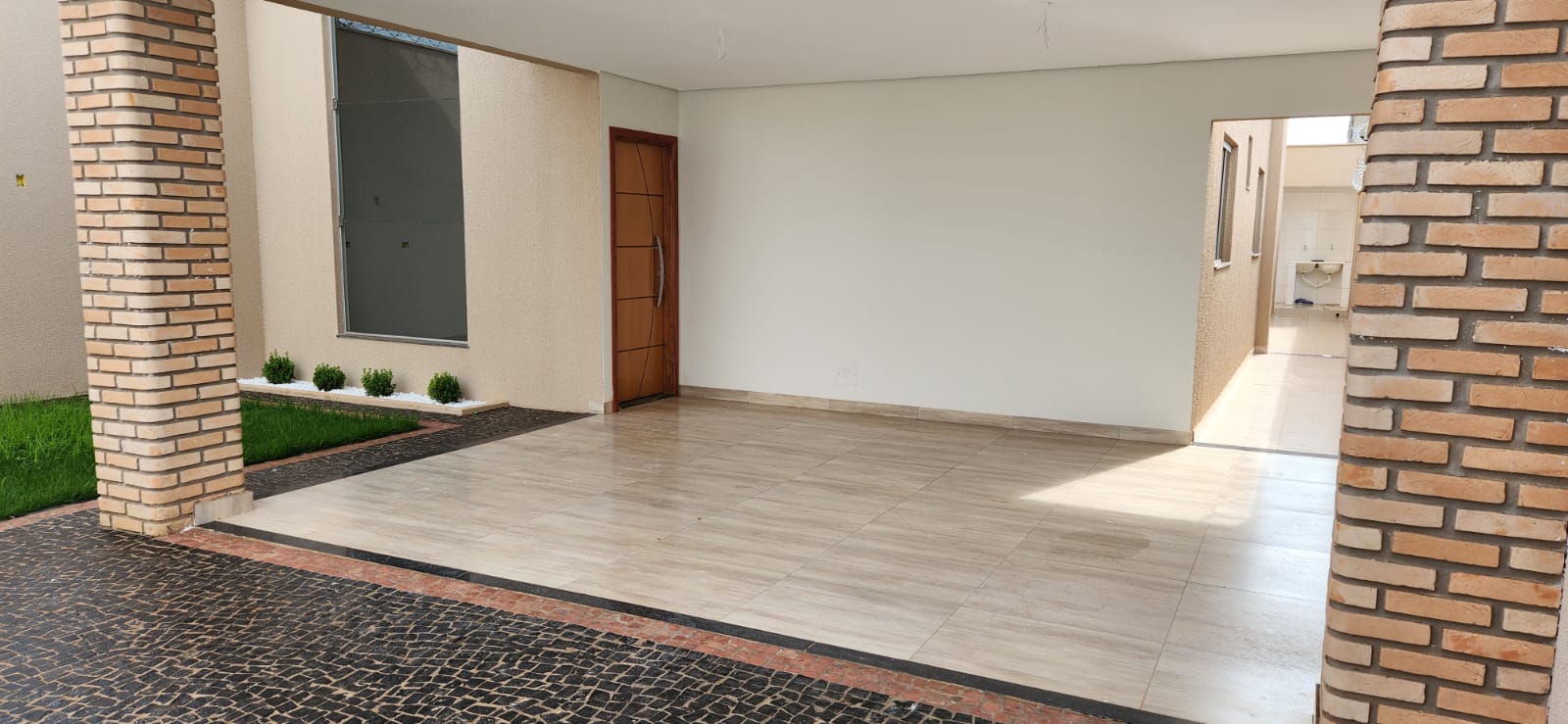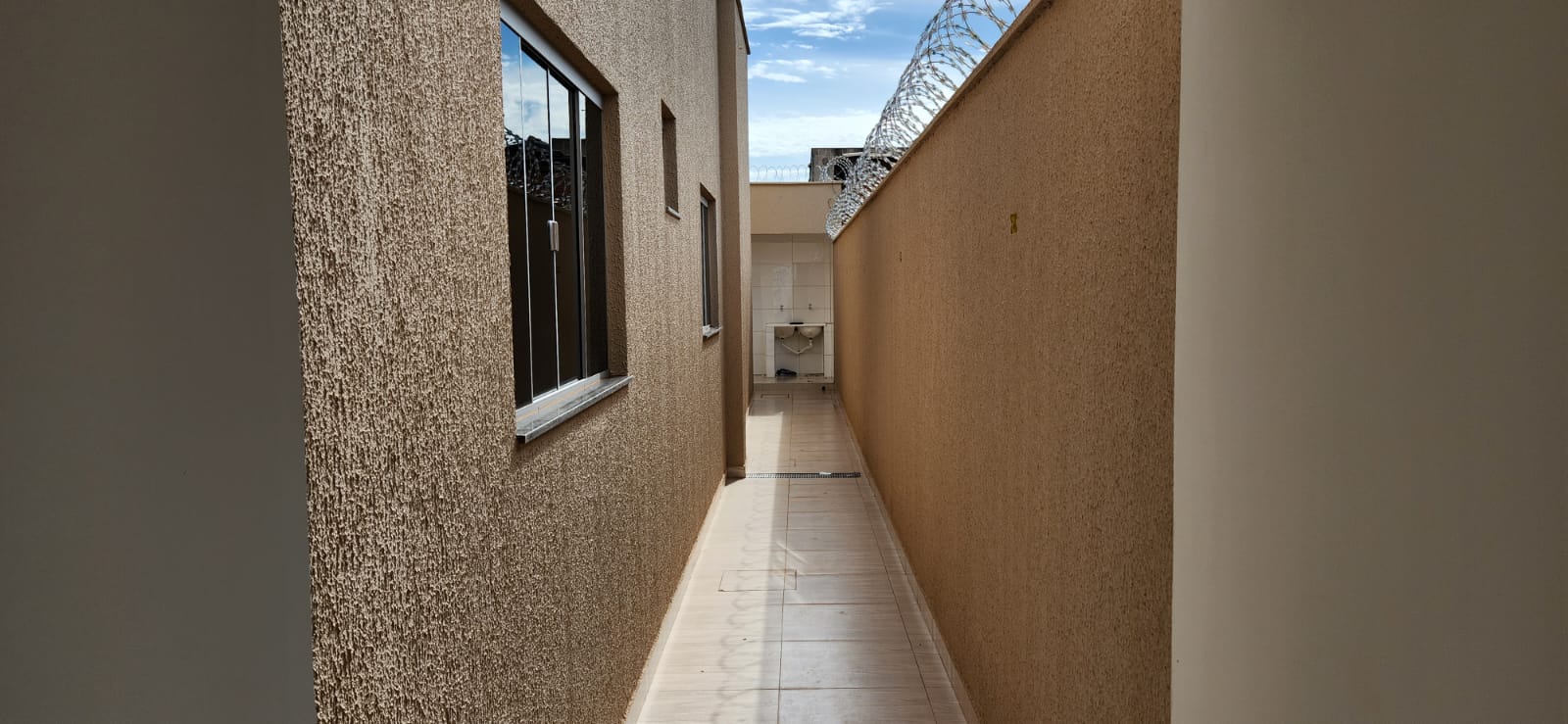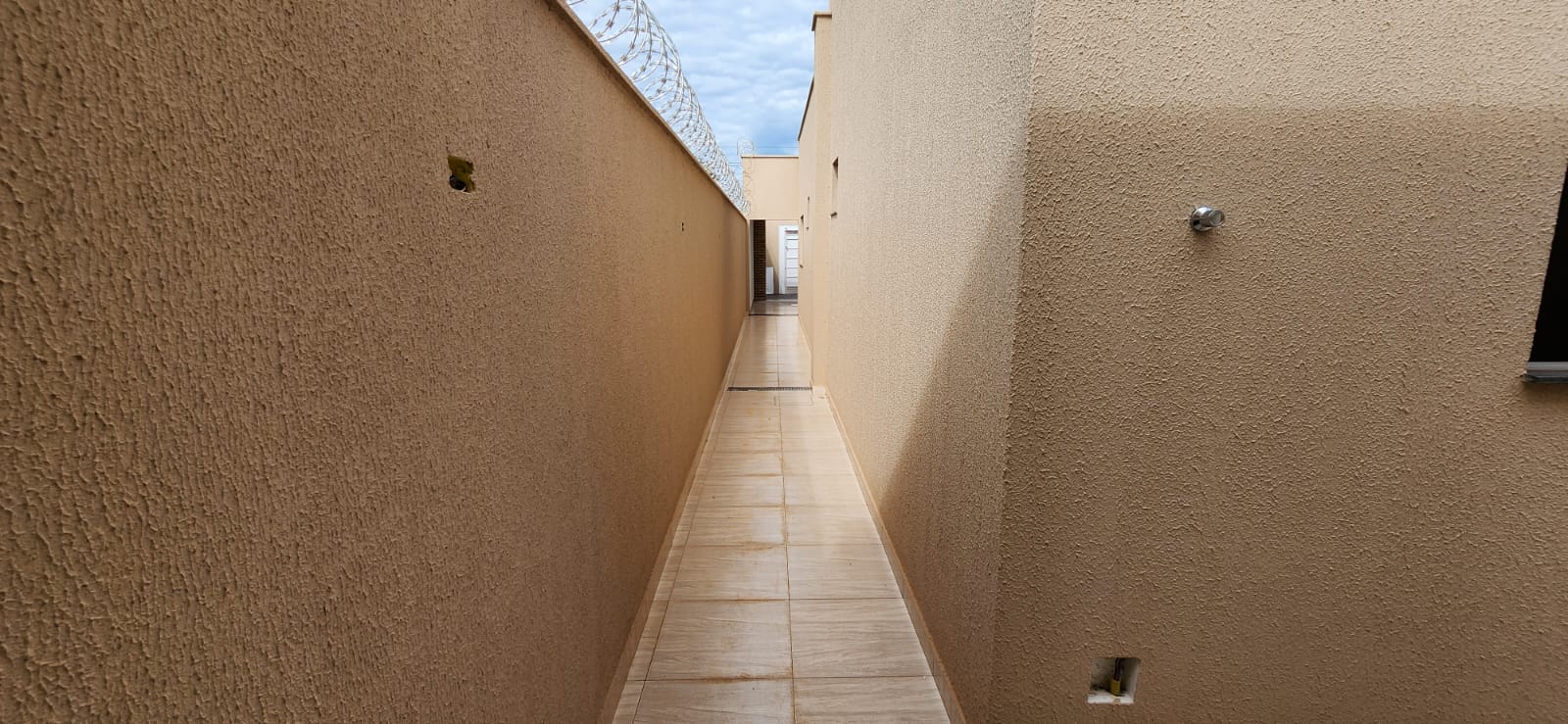 Calçada e frente da casa em pedra portuguesa preta com detalhe rosa, totalmente resinadas; Jardim com gramado e plantas ornamentais na frente da casa; Tubulação hidráulica 100% Tigre; Pré-instalação de ar condicionado e drenos em todos os cômodos; Tubulação de gás embutida para cooktop; Lixeira premium reforçada; Portão basculante de 3,50m, em alto padrão; Portão social com fechadura elétrica; Concertinas instaladas; Ducha na área externa; Piso em porcelanato, com rodapés embutidos; Lavanderia separada da casa;