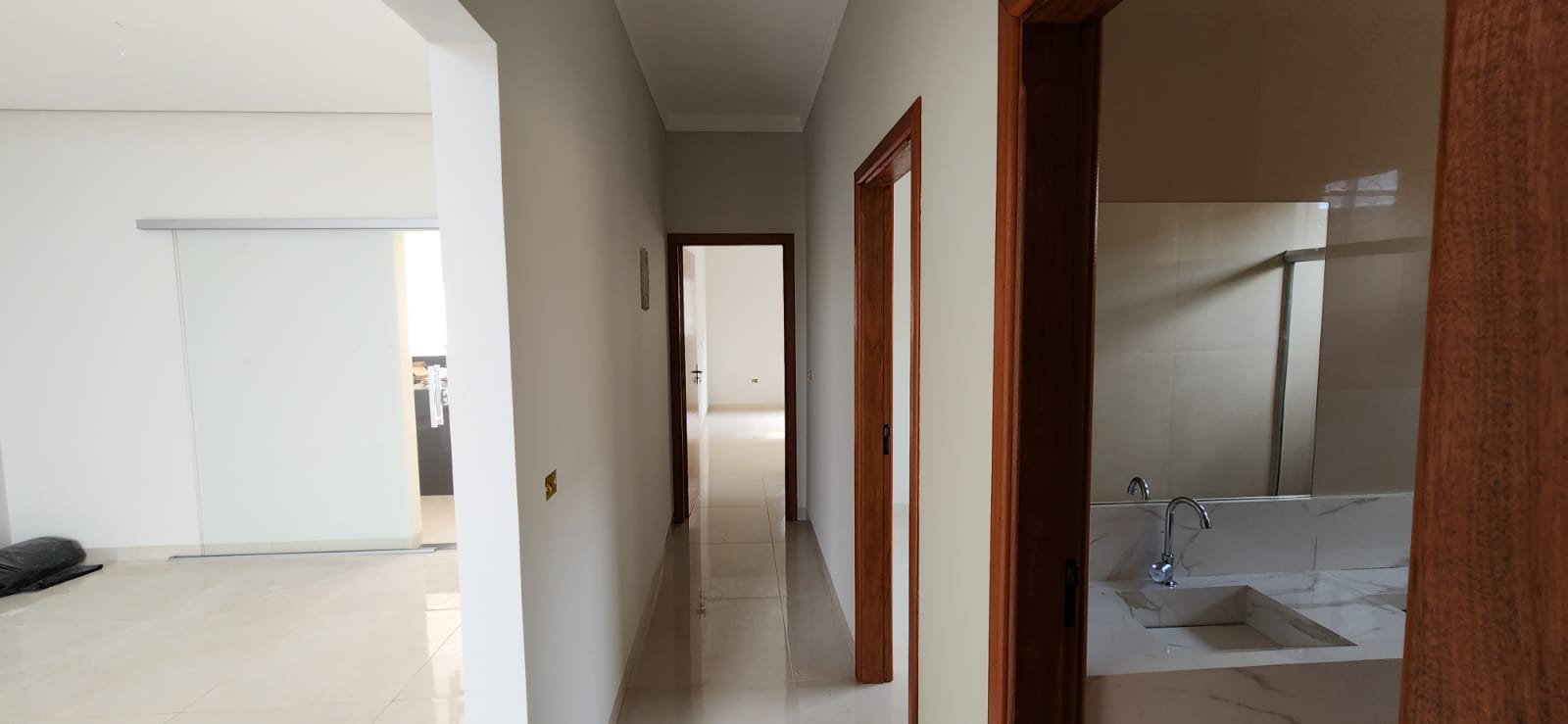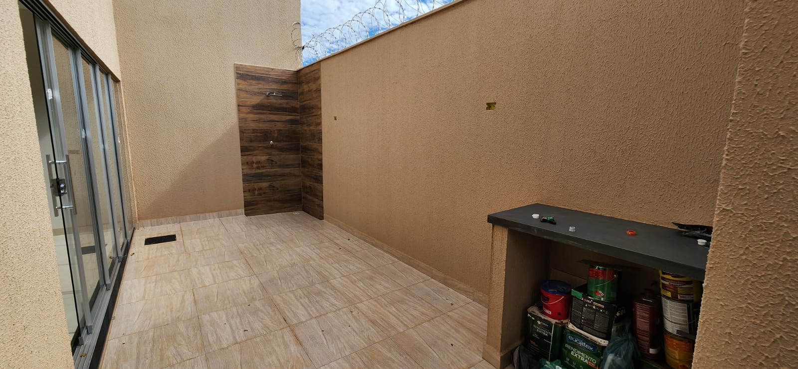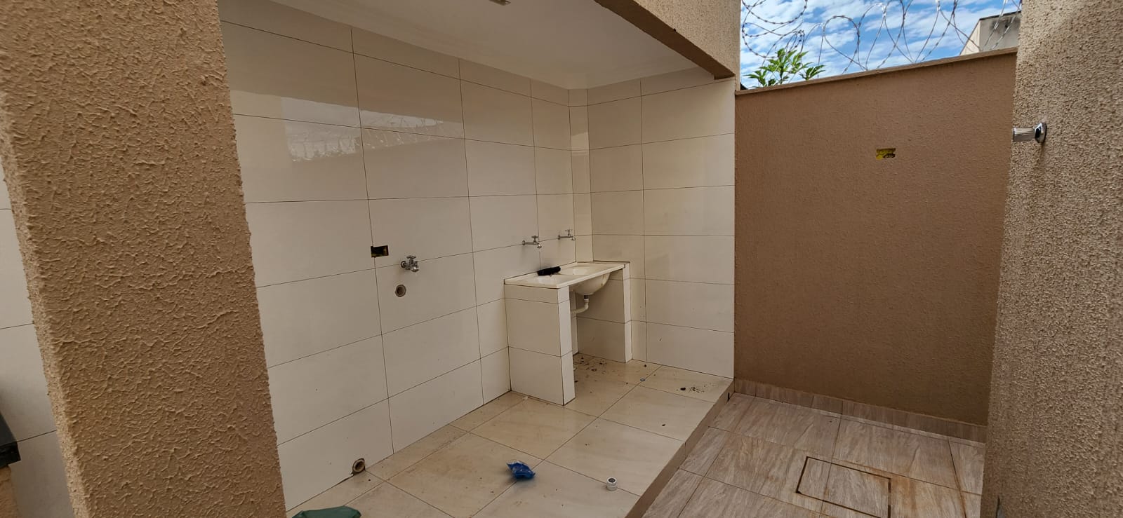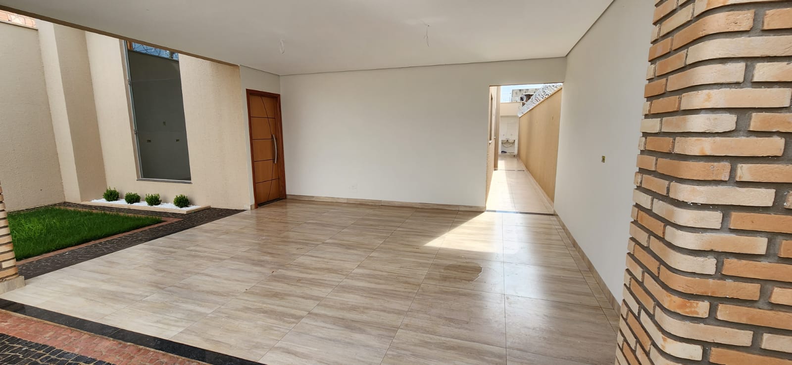 Calçada e frente da casa em pedra portuguesa preta com detalhe rosa, totalmente resinadas; Jardim com gramado e plantas ornamentais na frente da casa; Tubulação hidráulica 100% Tigre; Pré-instalação de ar condicionado e drenos em todos os cômodos; Tubulação de gás embutida para cooktop; Lixeira premium reforçada; Portão basculante de 3,50m, em alto padrão; Portão social com fechadura elétrica; Concertinas instaladas; Ducha na área externa; Piso em porcelanato, com rodapés embutidos; Lavanderia separada da casa;