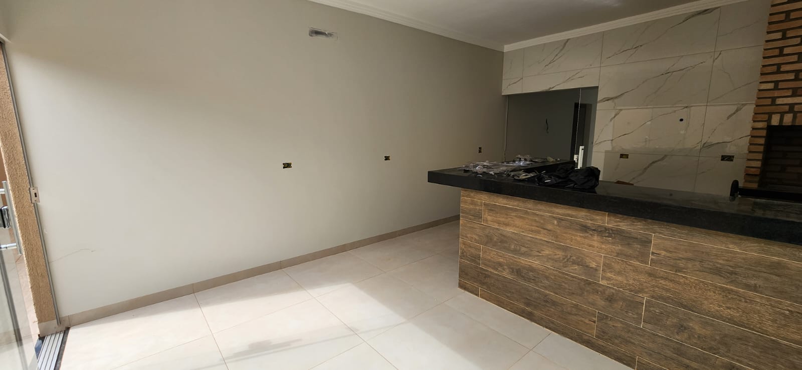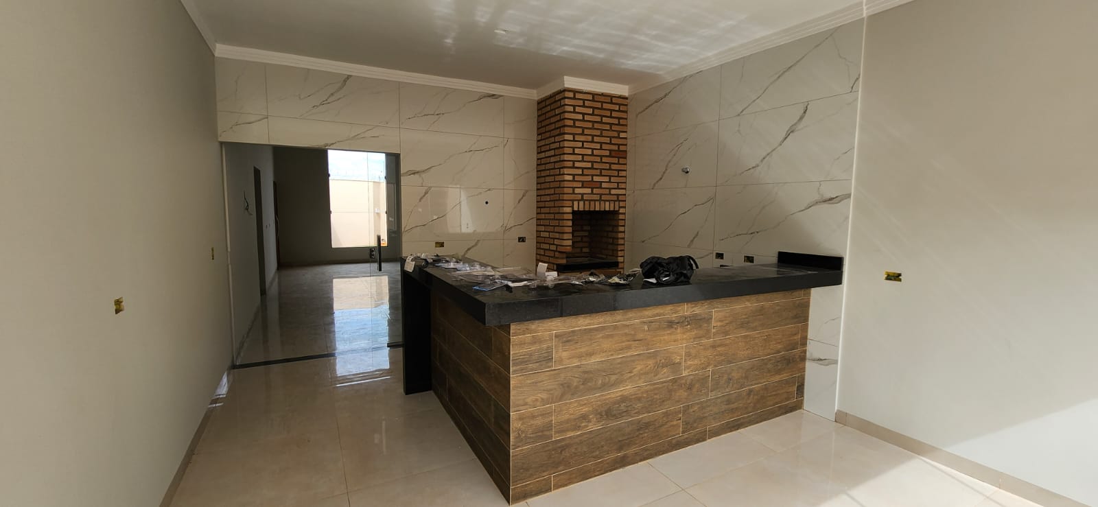 03 quartos (sendo 01 suíte), Sala com pé direito de 4 m, Cozinha/área gourmet espaçosa, com churrasqueira; Sala de jantar, Banheiros em porcelanato acetinado, com box em vidro temperado e pias esculpidas e nichos embutidos;
