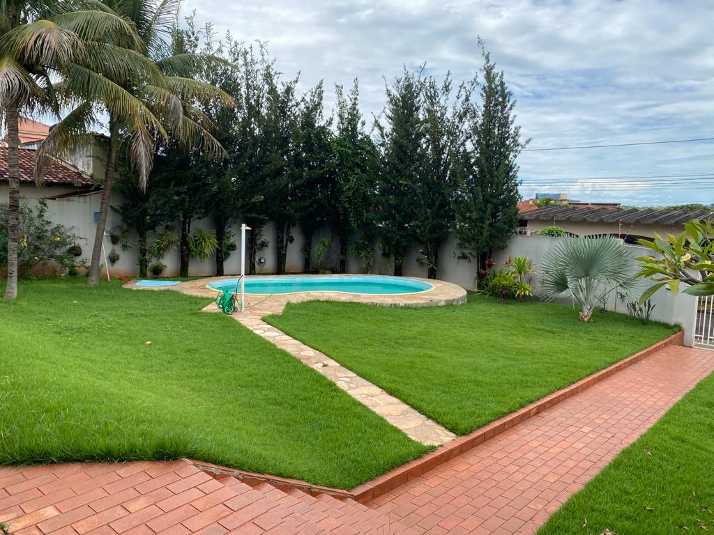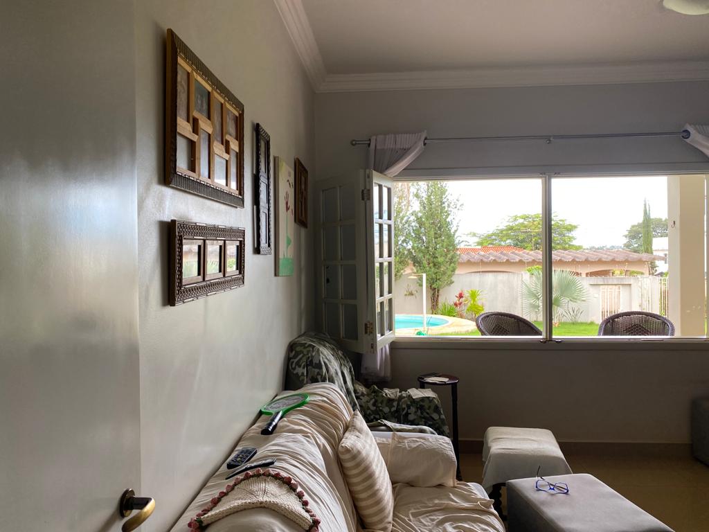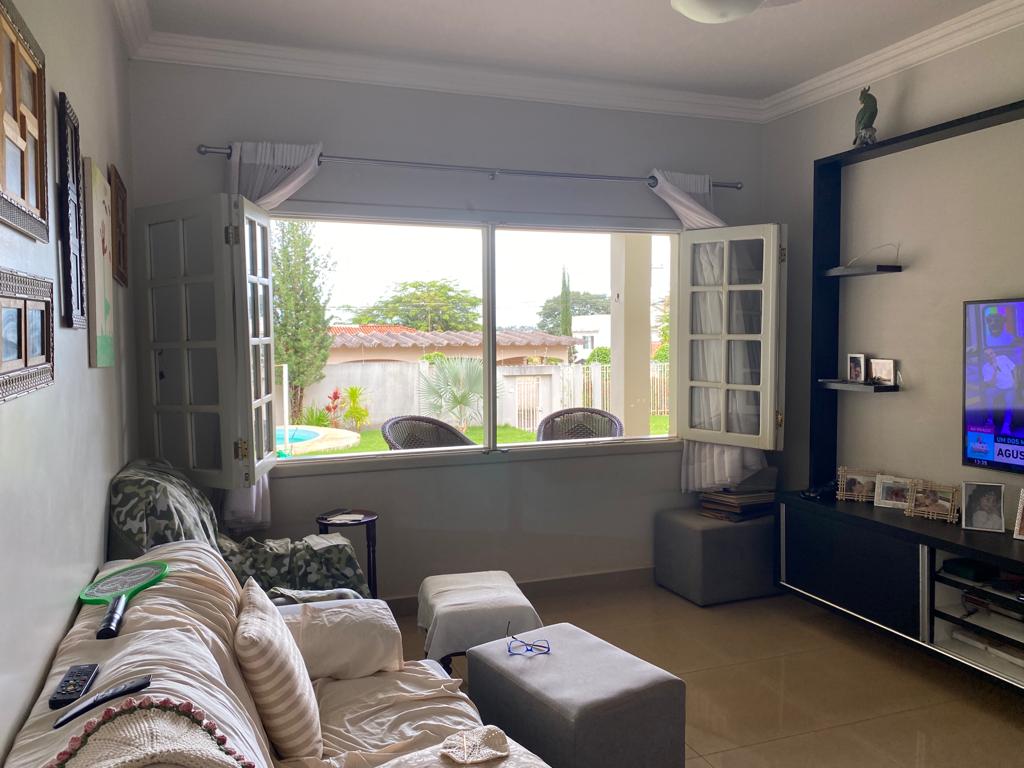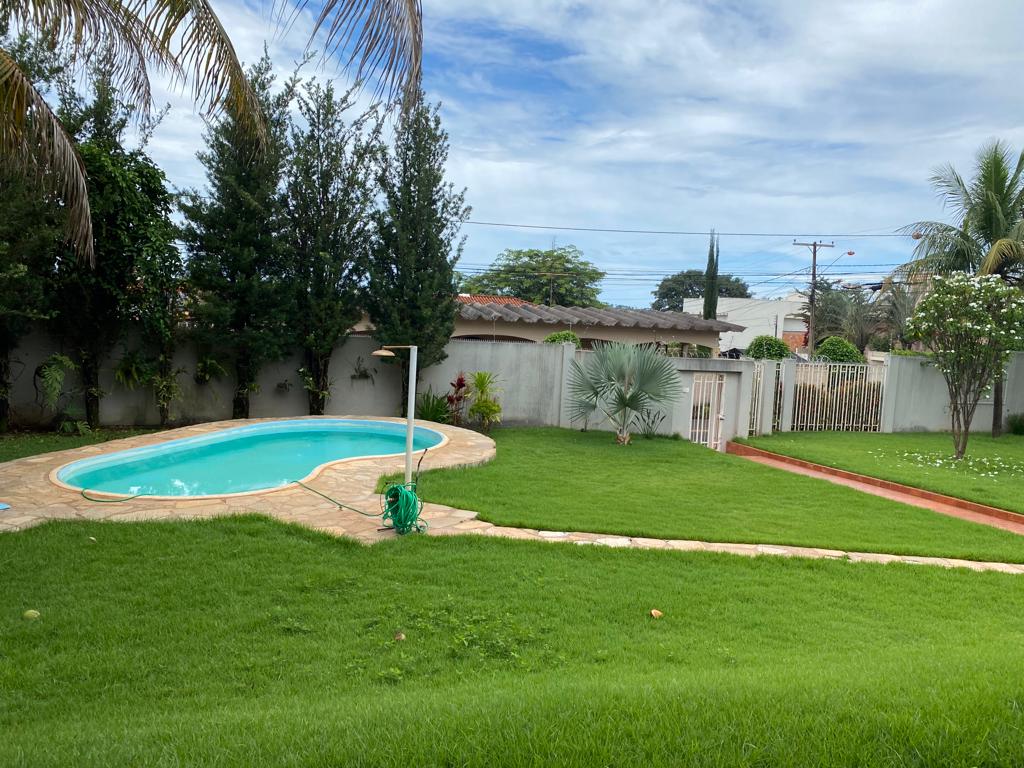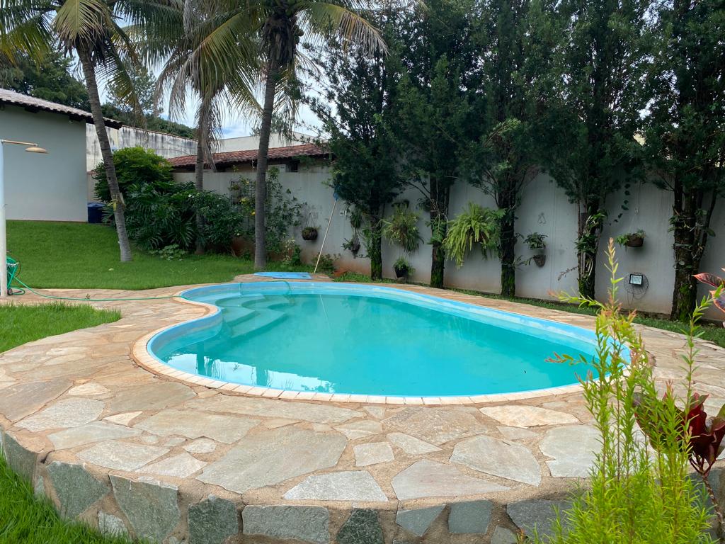 04 quartos sendo 02 suítes, ampla sala com dois ambientes, lavabo, cozinha com armários, área de serviços, banheiro, área de lazer com piscina, toda gramada com irrigação, cerca elétrica e câmeras.